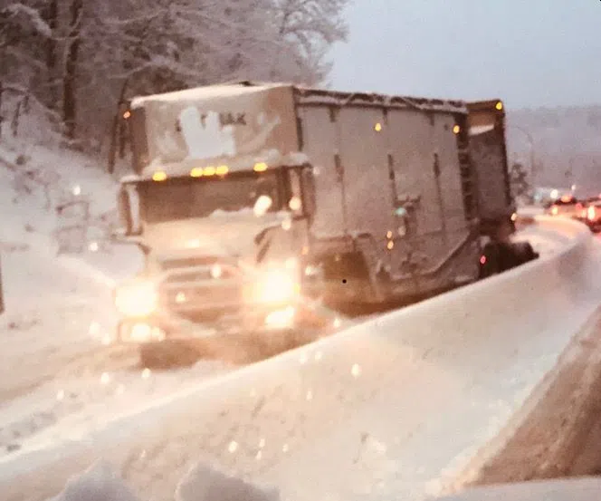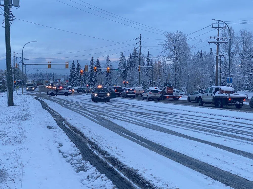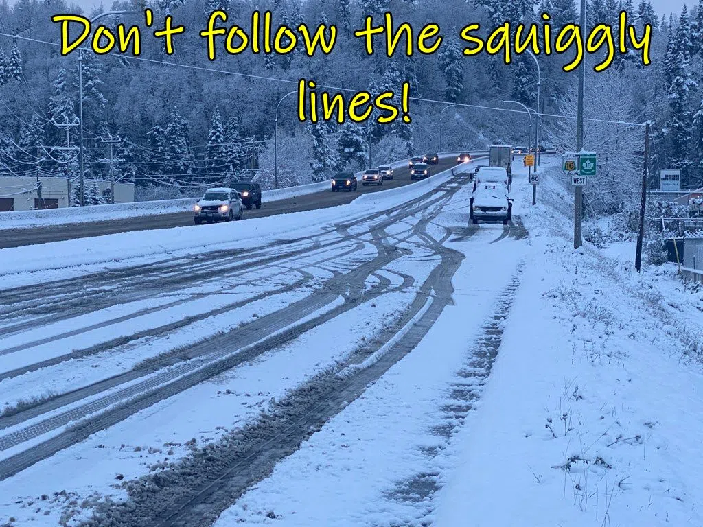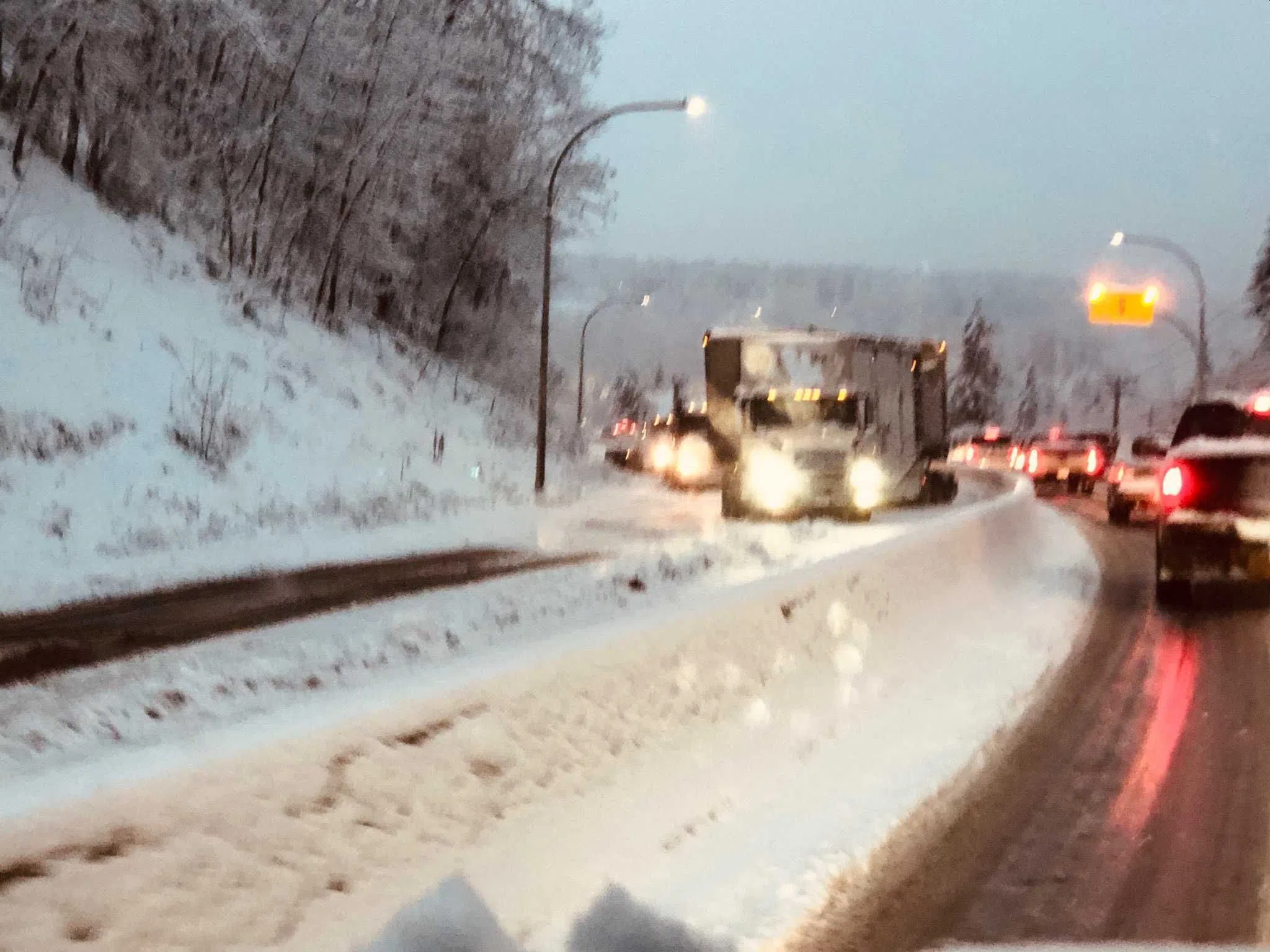 It was a mess on Peden Hill especially east bound after a truck got stuck going up. Traffic was rerouted while a line of trucks waited to chain up and tackle the hill one at a time. Here are a few pics from this morning on Prince George’s most famous hill when it snows.